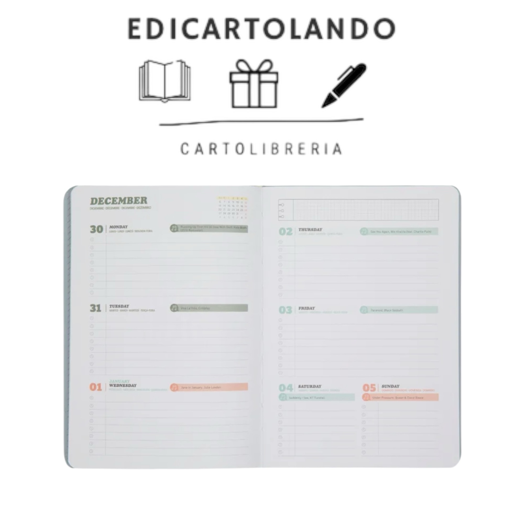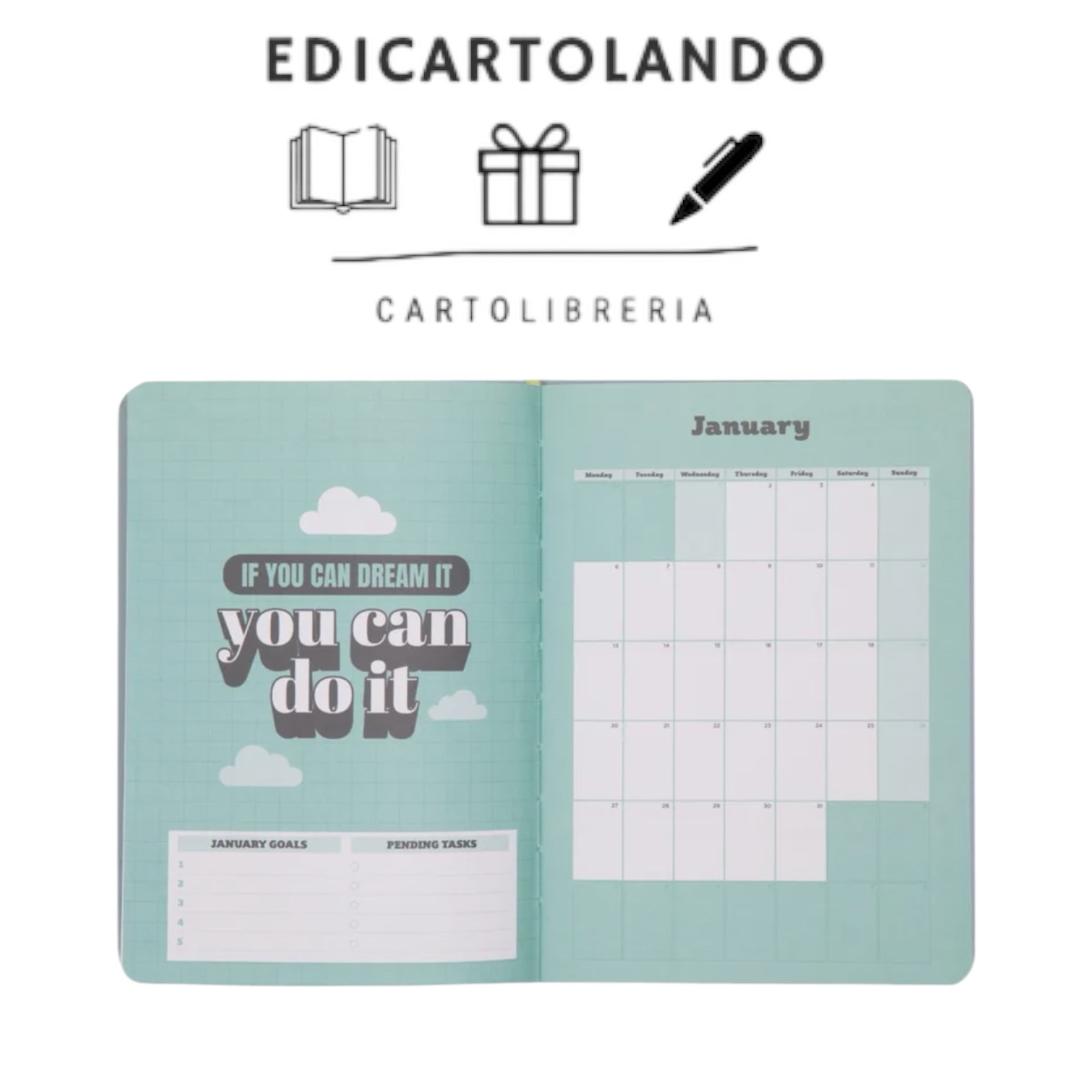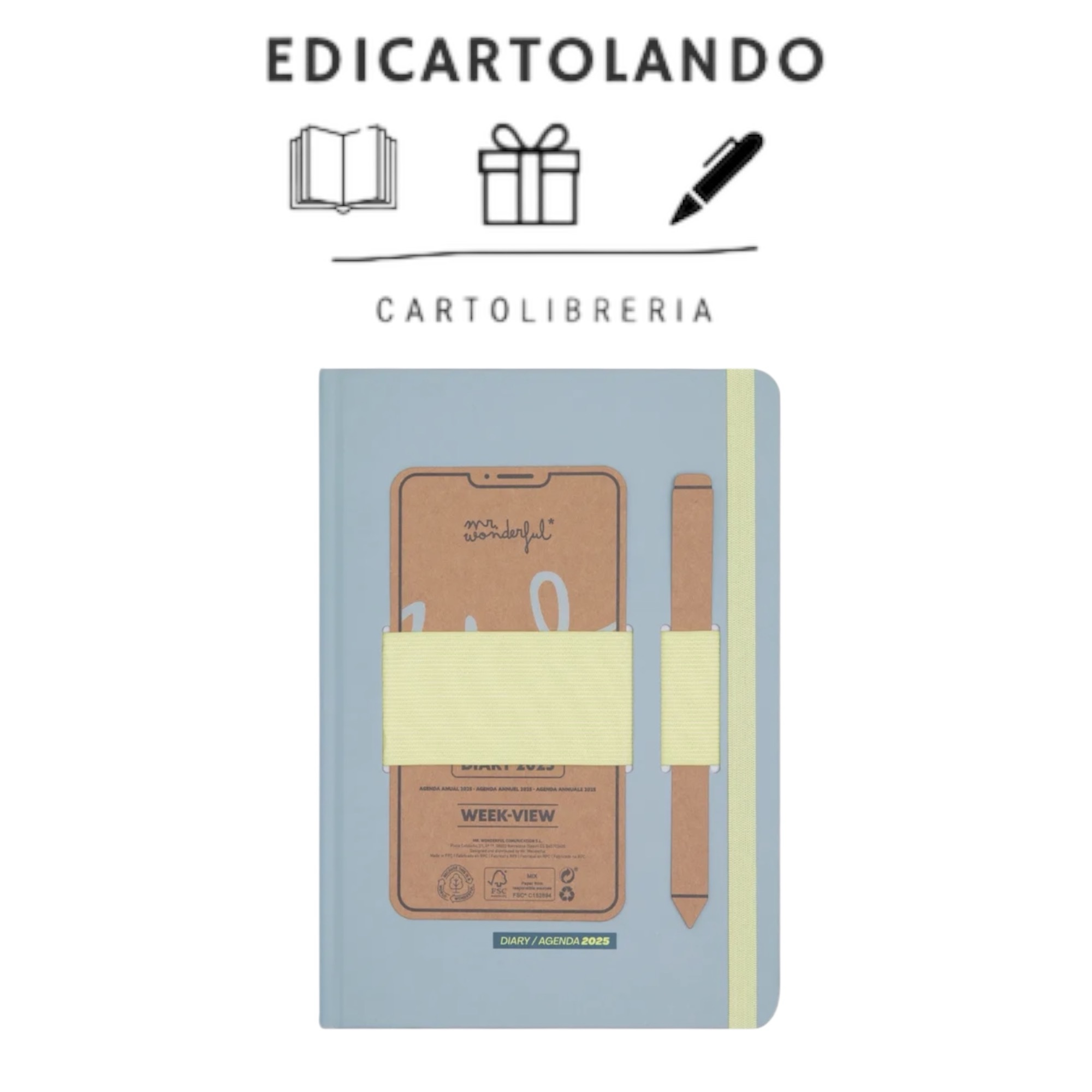 Un’agenda settimanale semplice e basilare, con meno contenuti interni rispetto alle altre agende Mr. Wonderful. Questa agenda va da gennaio a dicembre 2025 e incorpora sulla copertina un elastico per poter fissare il telefono cellulare e un altro per poter fissare una penna, il che la rende ideale per partecipare a riunioni, ad esempio. Sebbene la copertina sia in inglese, l’interno è disponibile in tutte le lingue (inglese, spagnolo, francese, italiano e portoghese).
