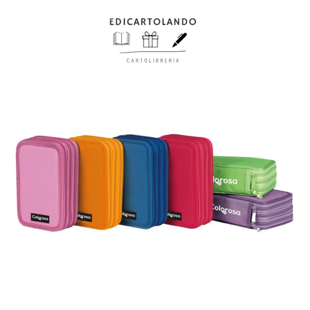 Astuccio 3 zip in tessuto resistente con bordi rinforzati colorati.