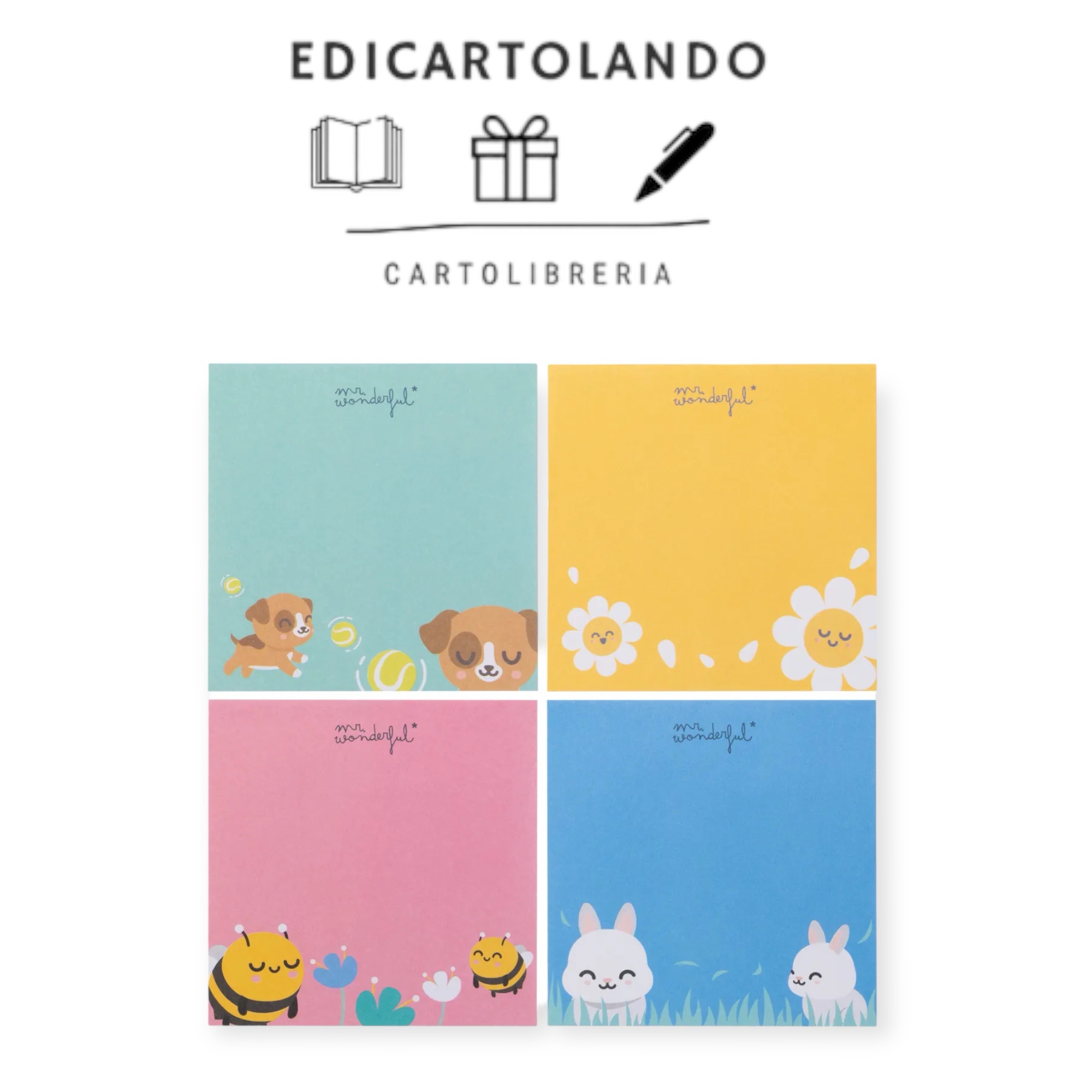 Scatolina di cartone il cui design imita una scatola di popcorn. All’interno troviamo un totale di 200 note di carta sfuse, con 4 design diversi che si alternano (margherita, cane, coniglio e ape).