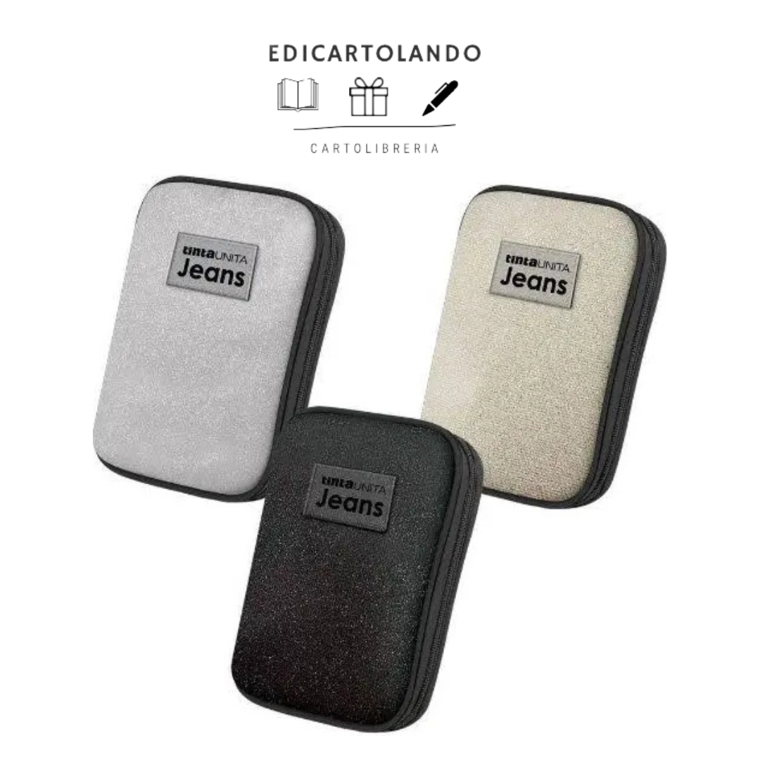 Astuccio monozip OneTime by TintaUINTA linea Jeans Lurex: l’utilitĂ dell’astuccio 3 zip, praticitĂ della zip unica senza rinunciare al design e all’inconfondibile glamour del glitter