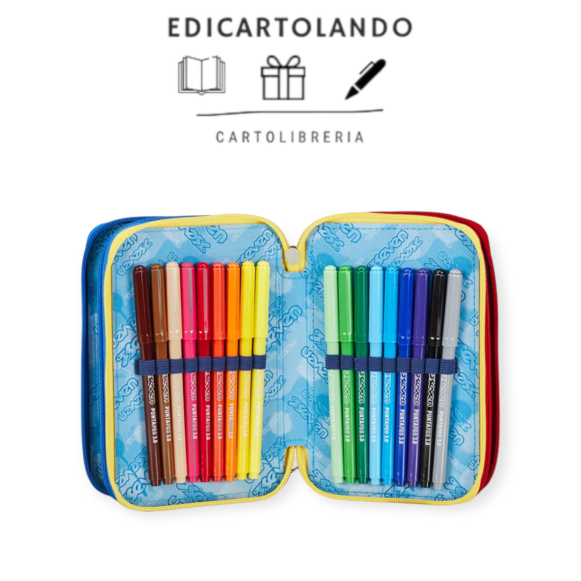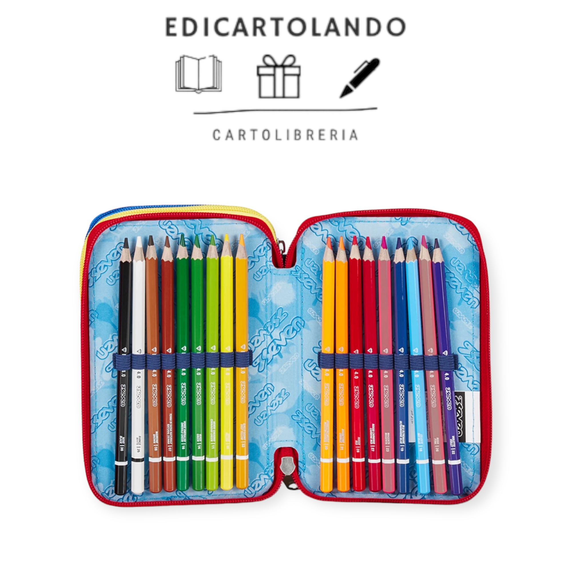 Astuccio Seven 3 zip ha tre scomparti in cui troverai tutto il materiale necessario per la tua giornata di scuola. A te non resta altro che abbinarlo a uno zaino o trolley Seven.