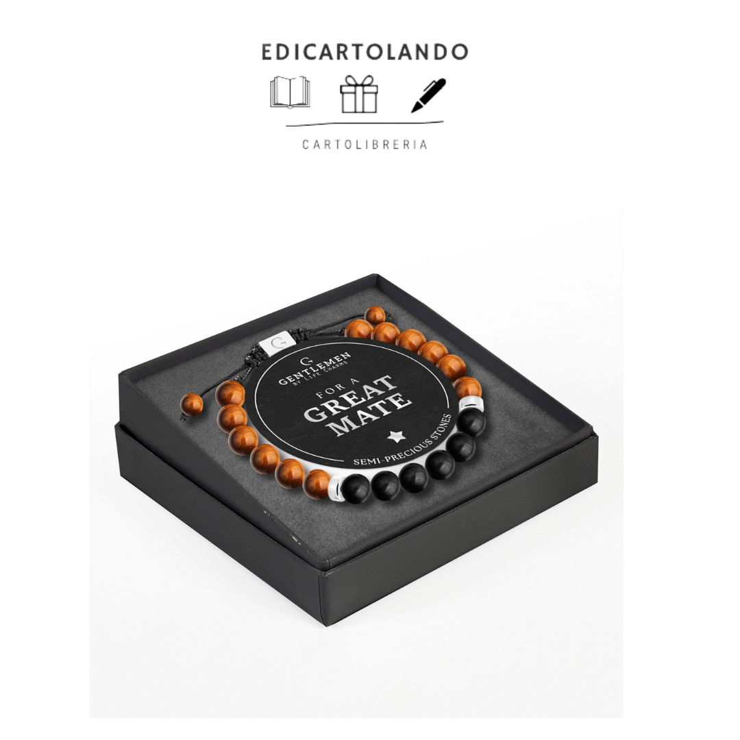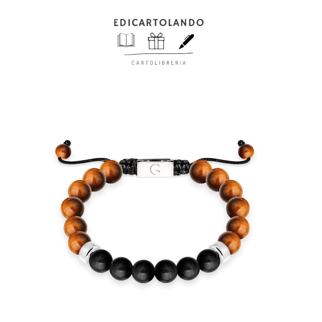 Bracciale regolabile da uomo con perline di agata nera e occhio della tigre da 8 mm presentato su inserto in pelle scamosciata grigia e confezionato in elegante scatola nera.