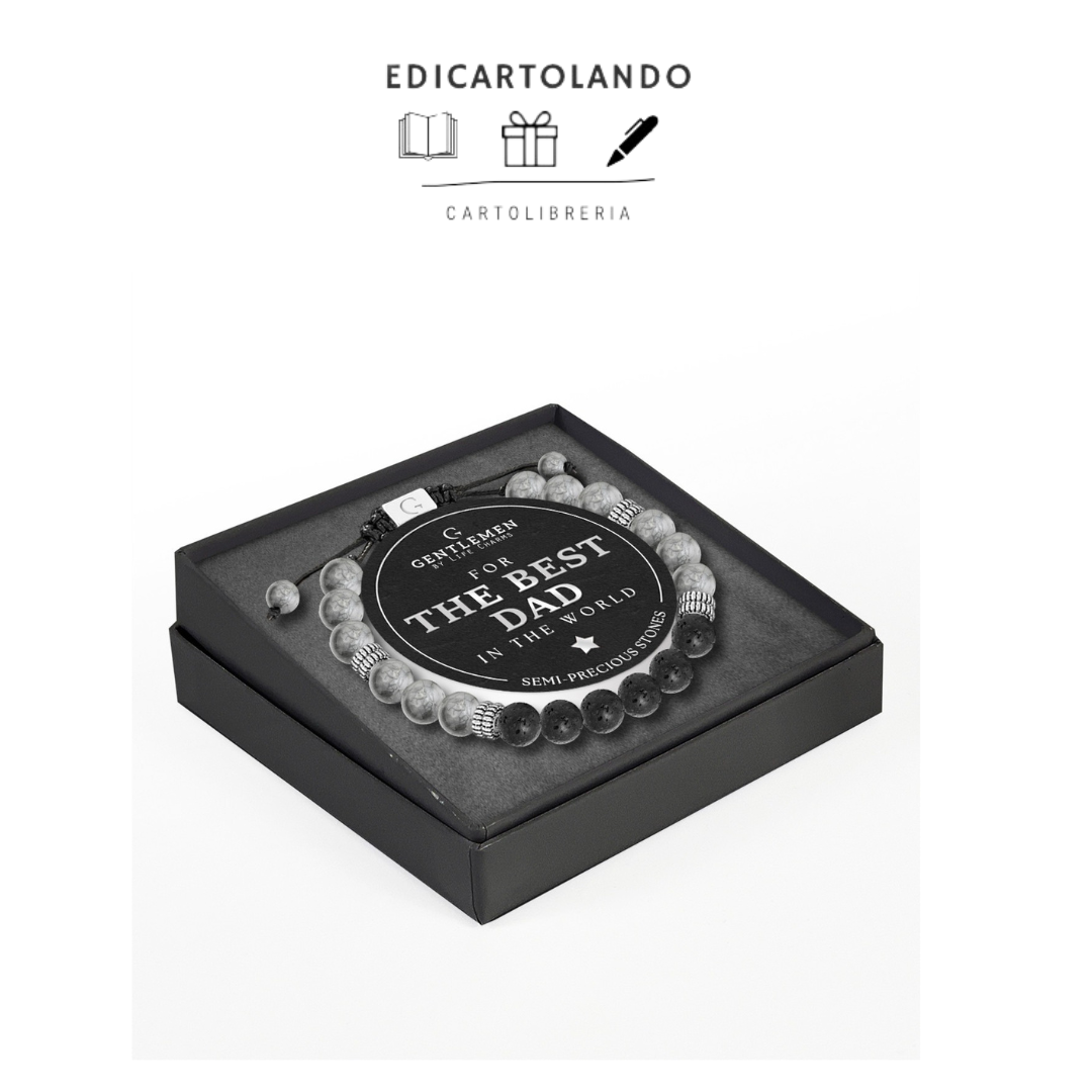 Bracciale regolabile da uomo con perle di diaspro grigio e pietra lavica da 8 mm presentato su inserto in pelle scamosciata grigia e confezionato in elegante scatola nera.