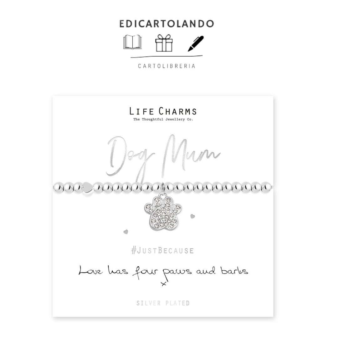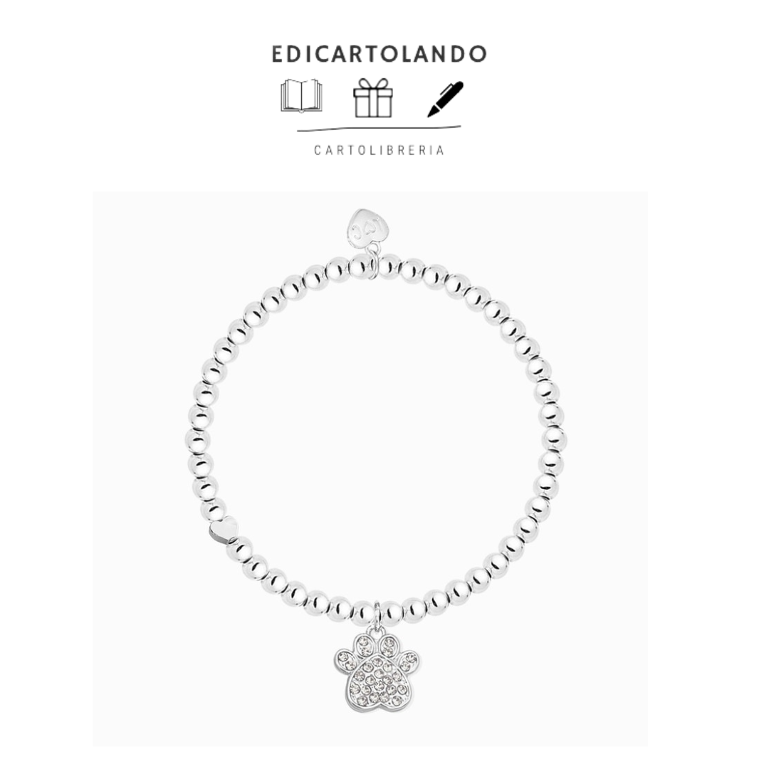 Ciondolo a forma di zampetta di cane placcato in argento presentato su un braccialetto elasticizzato con perline da 5 mm.