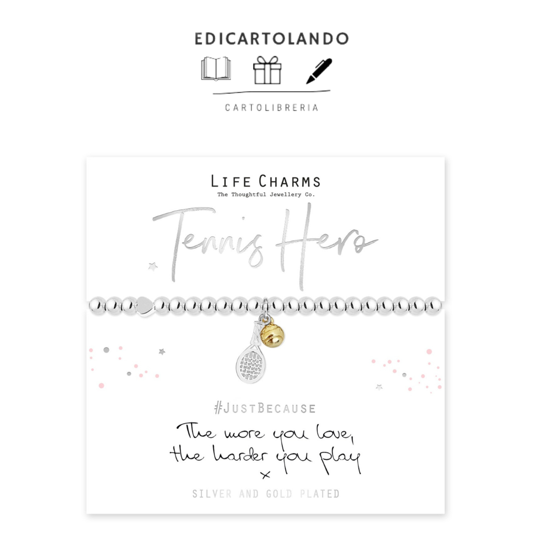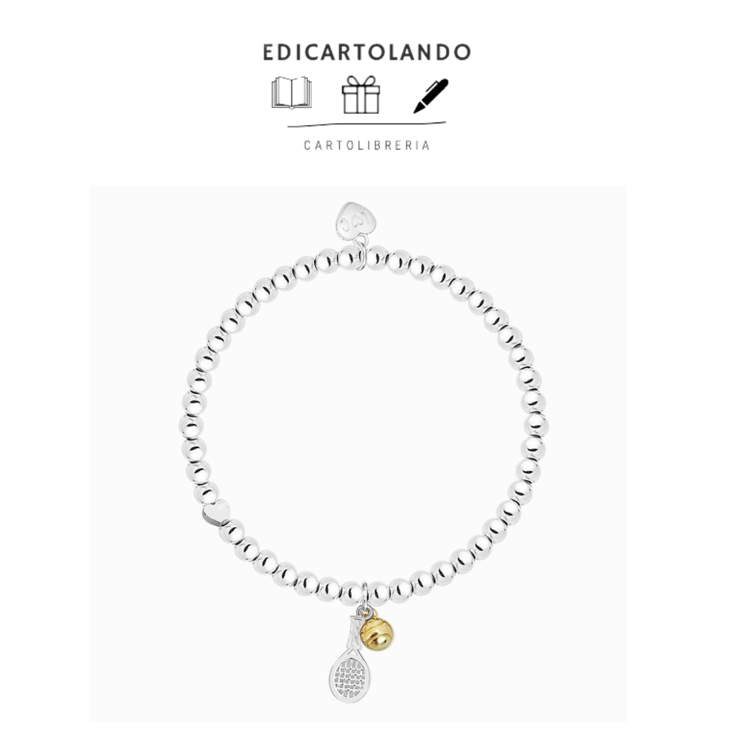 Ciondolo a forma di racchetta da tennis con pallina placcato in argento presentato su un braccialetto elasticizzato con perline da 5 mm.