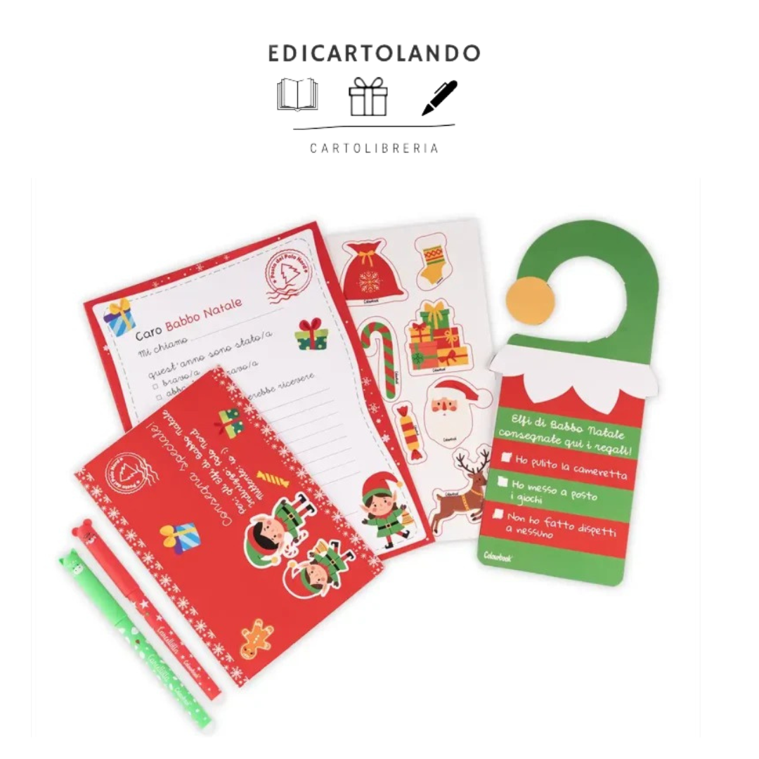 Il kit contiene tutto l’occorrente per preparare la letterina perfetta: carta stampata, busta coordinata, adesivi natalizi e un appendiporta speciale pensato per comunicare direttamente con gli elfi di Babbo Natale durante l’attesa dei regali.