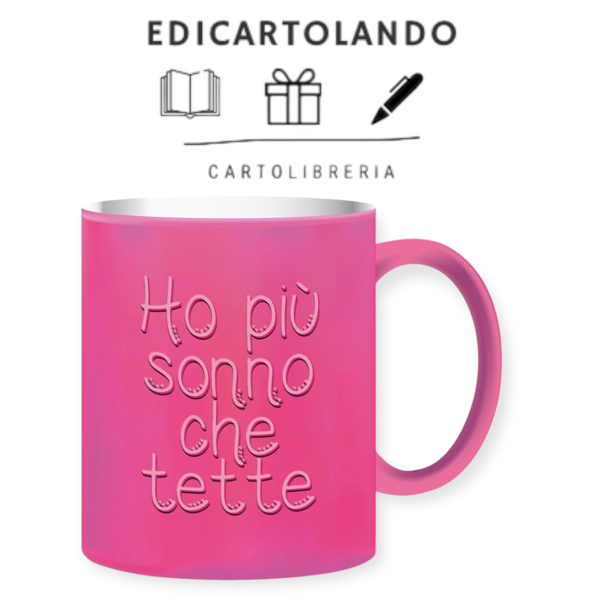 Tazza con manico in ceramica fuxia decorata con scritta rosa.