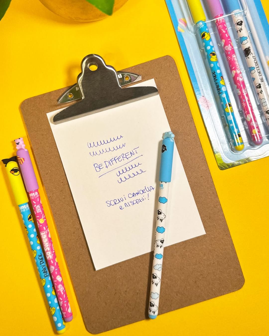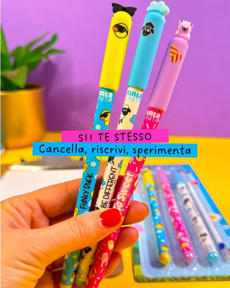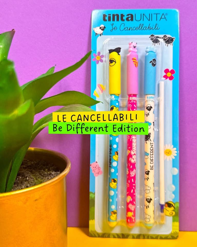 Tre personalità. Zero noia. Dimentica le solite penne: il set Be Different di tintaUNITA è lo statement definitivo per chi non ama passare inosservato. Grafiche pop iconiche e inchiostro termosensibile si uniscono in un’edizione limitata pensata per chi scrive, sbaglia e ricomincia con stile.
