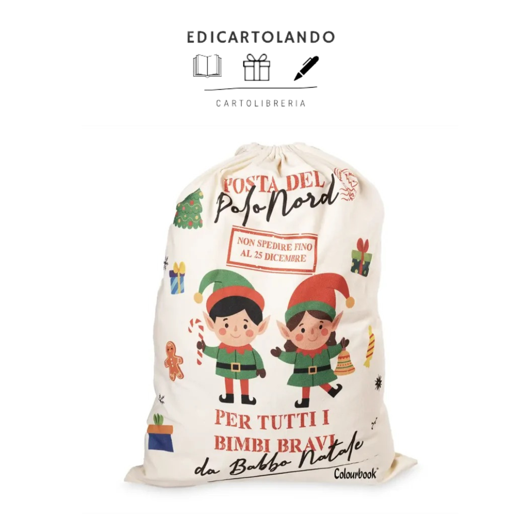 Tutti i regali per i bimbi bravi trovano posto nel Sacco di Babbo Natale Colourbook, l’accessorio perfetto per portare sotto l’albero magia, atmosfera e tanta praticità. Realizzato in misto cotone e poliestere, questo sacco natalizio decorativo è dotato di chiusura a coulisse e di un’ampia capienza, ideale per doni, giochi, gadget promozionali, packaging natalizio e allestimenti di punti vendita.