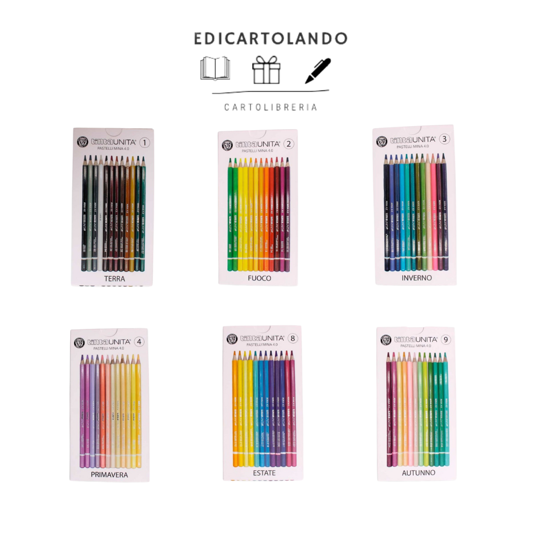 All’interno della valigetta troverai 6 scatole tematiche, ognuna con 12 colori, ispirate alle stagioni e agli elementi: