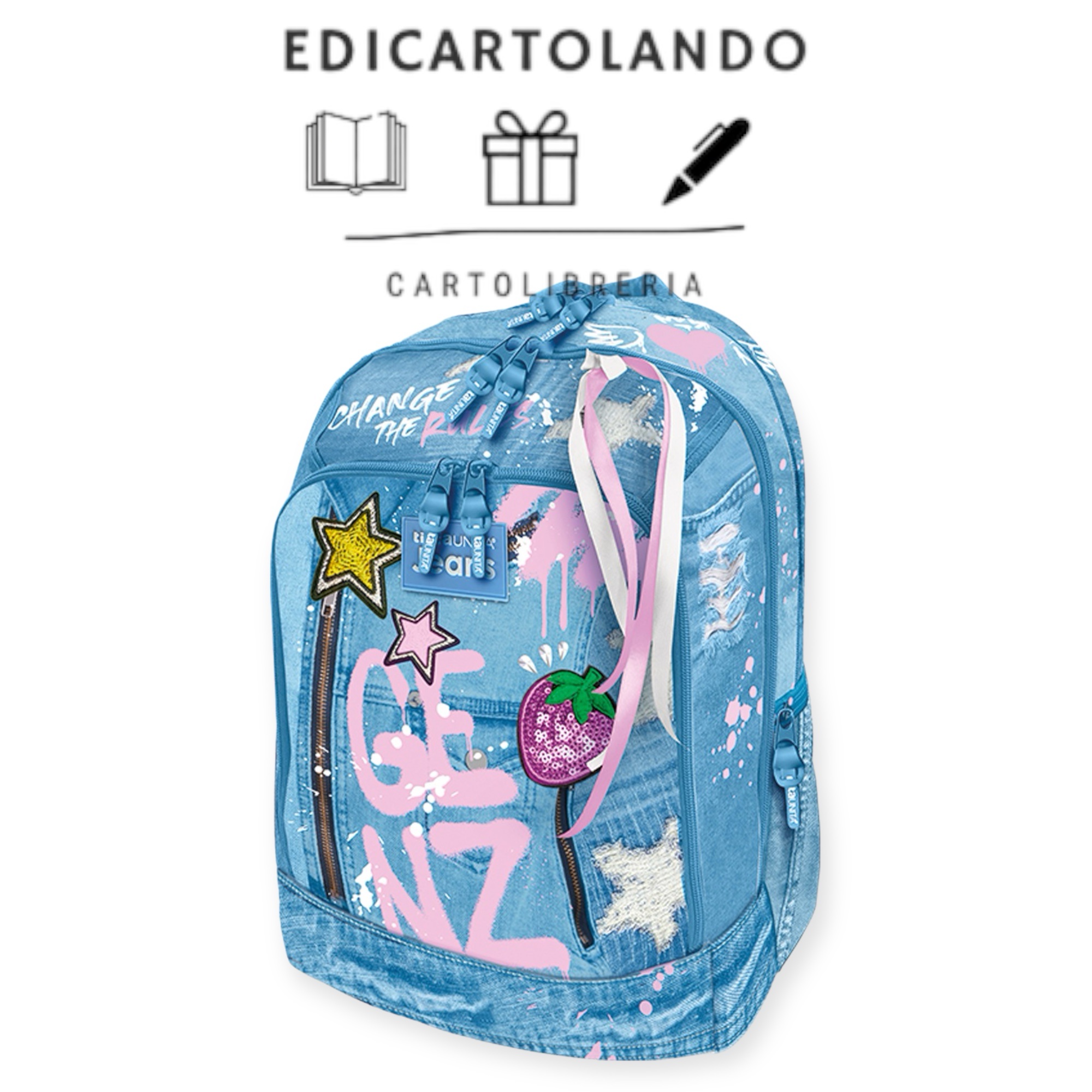 Zaino in poliestere stampato effetto Jeans, con fodera interna personalizzata, logo e tirazip in microiniezione, ha 3 ampie tasche frontali con chiusura a zip.